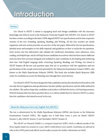 Get Ahead in MUET is a comprehensive coursebook to assist candidates who are sitting for the Malaysian University English Test (MUET). Based on the latest syllabus and the new test format, this book covers all the four sections in the test, which are Listening (Paper 1), Speaking (Paper 2), Reading (Paper 3) and Writing (Paper 4).